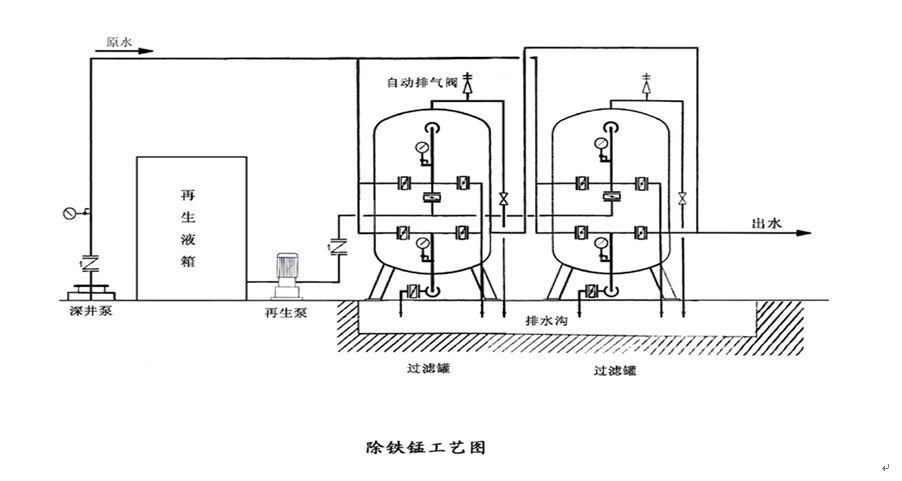除鐵錳過濾器由曝氣裝置和錳砂過濾罐組成;利用氧化法將水中低價鐵離子和低價錳離子氧化成高價鐵離子和高價錳離子,再經(jīng)過吸咐過濾去除,降低水中鐵錳含量。